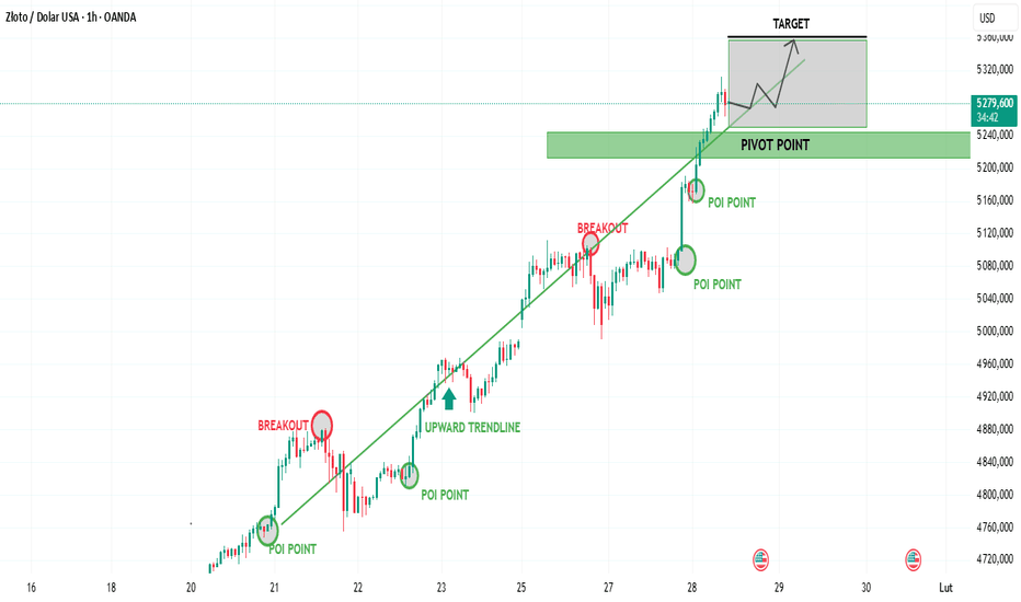 XAU (1H) – bycza kontynuacja, spadek zostaje wchłoniętyZłoto w dalszym ciągu utrzymuje stabilną, wzrostową strukturę w kanale wzrostowym. Ostatnie korekty powróciły do strefy popytu u zbiegu FVG, pokazując, że presja zakupowa w dalszym ciągu dobrze się wchłania.
