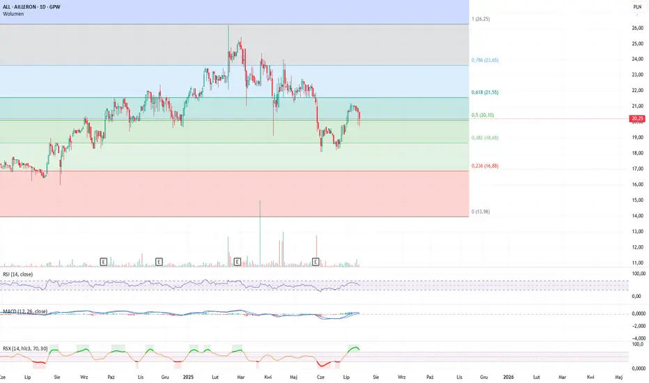 Kurs próbuje utrzymać się na 50% zniesienia Fibonacciego oraz pod EMA26/50/144/200. To ważna strefa – jeśli się obroni, możliwa kontynuacja w stronę 21,60 zł (61,8 zniesienia Fibonacciego ). Jednak obecna słabość wolumenowa sugeruje raczej boczny układ trend.