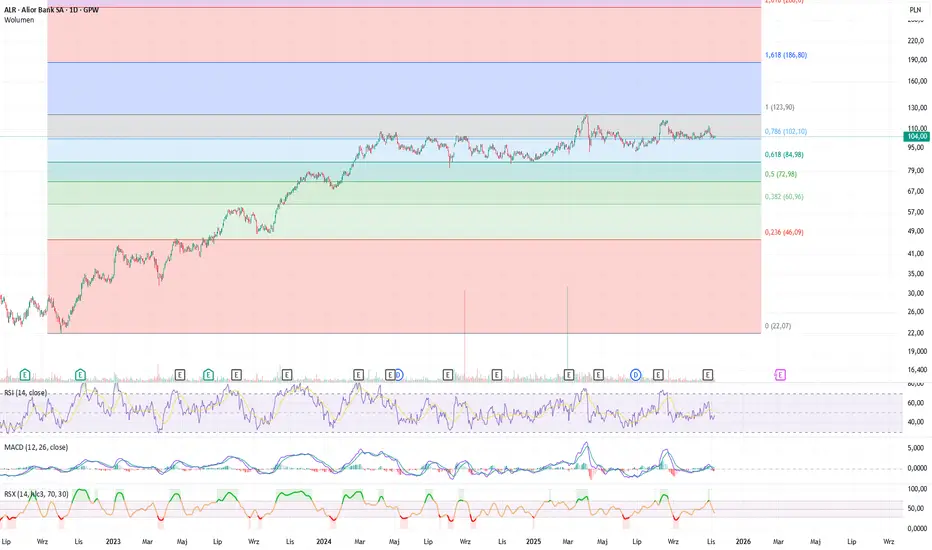 Dodając do wykresu zniesienia Fibonacciego od starty wzrostu w październiku 2022 do ATH na 123zł w kwietniu tego roku. To dzisiaj kurs jest tuż przy wsparciu 102zł czyli 78,6% zniesienia Fibonacciego.