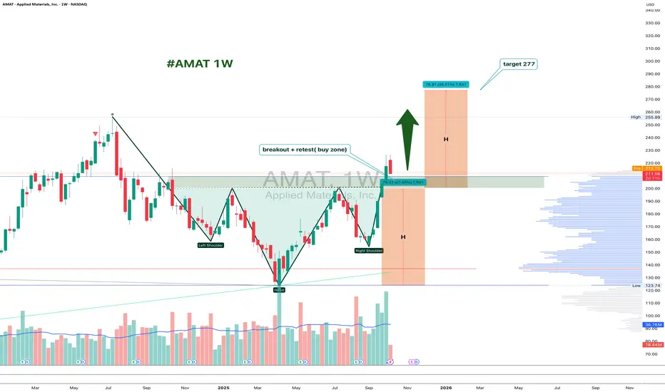 On the weekly chart, Applied Materials (AMAT) has completed a clean inverted head and shoulders breakout around $226, and is now pulling back to retest the neckline zone near $200–211.