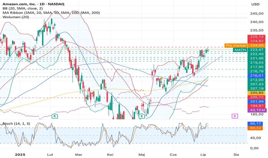 Stochastic znajduje się blisko 100 → rynek jest wykupiony, co może prowadzić do korekty lub konsolidacji. Jeśli cena wybije opór 225 USD, możemy otowrzyć pozycję długą, aczkolwiek są szanse na pullback (Korekte)