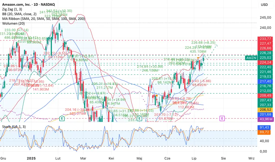 Amazon wreszcie wyłamał się z konsolidacji, cena 225 USD testuje kluczową strefę oporu (224–227 USD). Wybicie powyżej tego poziomu może otworzyć drogę w kierunku 233 USD (kolejny techniczny opór z marca)! Cena znajduje się powyżej MA20, MA50, MA100 i MA200 – klasyczny układ byczy ale Stochastic może sygnalizować potencjalną małą korektę.