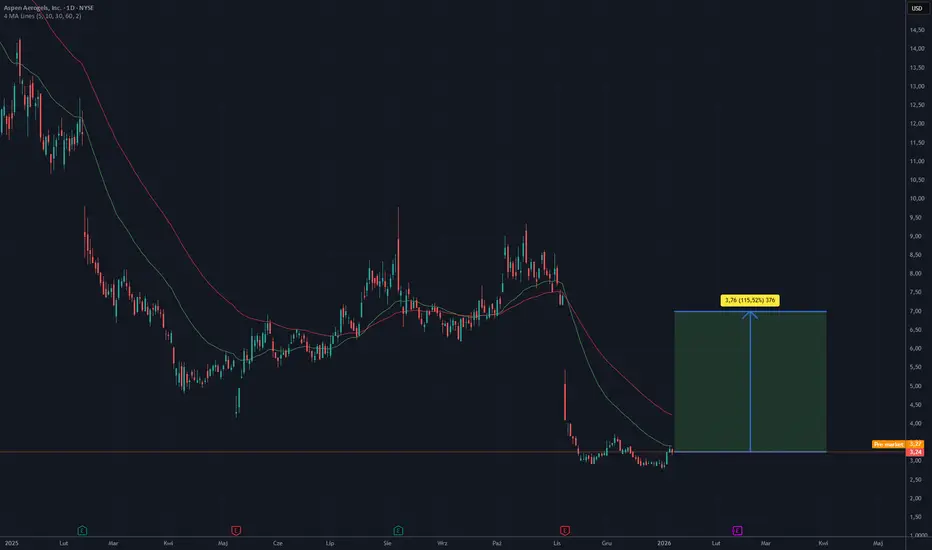 Wykres spółki Aspen Aerogels pokazuje długotrwały trend spadkowy, który w ostatnim czasie wyraźnie wyhamował. Po silnej przecenie kurs ustabilizował się w rejonie 3,20–3,40 USD, tworząc wyraźną strefę popytową, która była kilkukrotnie broniona przez kupujących. Taka struktura sugeruje wyczerpanie presji podażowej oraz możliwość rozpoczęcia fazy akumulacji.