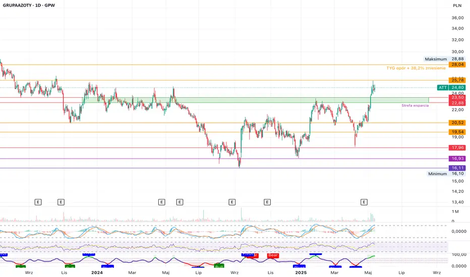 Zdecydowanie ważniejszym jednak poziomem i celem do którego byki mogą dążyć jest okolica 27,8-28,0 zł. Nakładając zniesienie Fibonacciego od szczytu ze stycznia 23 roku do dołka znajduje się tam fibo 38,2% dodatkowo historycznie widać, że kurs w tej okolicy działał zarówno jako wsparcie jak i opór.