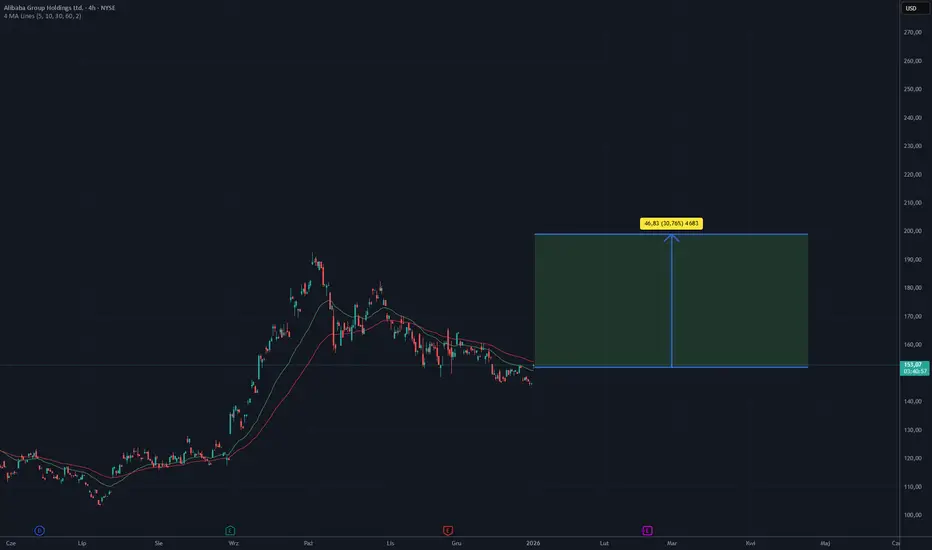 Wykres Alibaba Group Holding (BABA) na interwale 4-godzinnym pokazuje, że kurs znajduje się obecnie w rejonie silnego wsparcia w okolicach 150–153 USD, po wcześniejszej korekcie spadkowej. Spadkowa dynamika wyraźnie osłabła, a cena zaczęła stabilizować się, co sugeruje, że presja podaży jest stopniowo wygaszana.