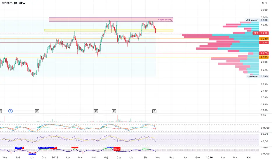 Technicznie kurs odbija od strefy podaży przy 3530 zł i przełamał wsparcie 3255–3300 zł. Kluczowy poziom to okolice 3210 zł (POC) – utrzymanie będzie wsparciem dla byków, ale zejście poniżej 2900 zł otworzyłoby drogę do formacji podwójnego szczytu z zasięgiem w okolicy 2400 zł. Oscylatory wciąż sugerują przestrzeń do korekty.