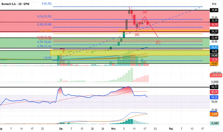 Ktoś wpompował w akcje kilkadziesiąt milionów żeby wyciągnąć kurs tak wysoko. Pytanie czy to ma oparcie w fundamentach czy to tylko spekulacja i łapanie leszczy? Pisałem o tym nie raz i wystarczy. Czysto technicznie jak pisałem wcześniej kurs odbił od dna i zaliczył poziom 0.38 fibo. Teraz mamy naturalną korektę. Być może jak zaznaczyłem na wykresie przyjmie kształt trójki ABC. Na wyczerpanie tego impulsu wskazywały wskaźniki na maksymalnym poziomie wykupienia i wielkie obroty. Ktoś tam widział wisielca. Każda korekta tego typu jest zdrowa dla trendu i to tak silnego. To schładza wskaźniki daje szansę na realizację mega zysków a kolejno prowadzi do reakumulacji przy założeniu kontynuacji trendu. Czy to może być jednak koniec wzrostów? Może ale za wcześnie o tym pisać. Pierwszym sygnałem będzie np pojawienie się nie trójki korekcyjnej tylko piątki impulsowej w dół. Z kolei o kontynuacji trendu wzrostowego poinformuje D1 z zamknięciem powyżej ostatniego szczytu. Na pewno spółka przyciąga w związku z pojawieniem się obrotów które pozwalają grać dużym kapitałem. Nie ważne co rysujecie ważne ile z tego wyciągacie :-)