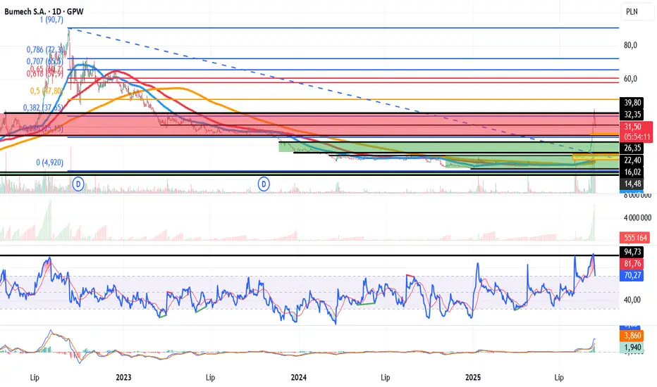 Bum przeżywał swoje chwile euforii i upadku. Euforia to mega wyniki z wydobycia węgla przy niebotycznych cenach kontraktów. Po tym spektakularny zjazd z 99 zł do 8 zł Po drodze ściemniane ESPI o kopalniach boksytów, kopalniach w RPA statkach widmo z węglem z RPA jakaś sprawa karna prezesa który wcześniej zapomniał zgłosić ruchy na akcjach. Teraz kolejna euforia po ESPI o produkcji wozów pancernych /trzech do końca 2026 na potrzeby pokazów/. Wzrost był techniczny ale niebotyczny. Spodziewałem się jakiegoś odbicia ale nie aż takiego. Dla porządku sam od lat nie mam ich akcji tylko prowadzę kurs. Założyłem że albo do zmiany trendu na wzrostowy albo do upadku :-).