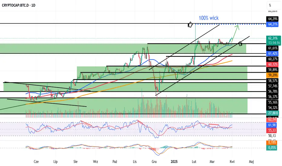 Indeks dominacji jak w tytule ciągle wysoko. Na dodatek mamy jeszcze ten cień do zebrania. Co to oznacza dla altów nie muszę pisać. Wskaźniki powoli rosną. Poziom wsparcia 61.60 % trzyma kurs. No i kanał wzrostowy. Jak na razie zmian nie widać więc trzeba uzbroić sie w cierpliwość.