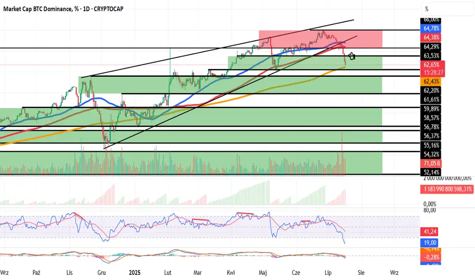 Na wykresie sytuacje jest w miarę czytelna. Mamy wybicie dołem z niedźwiedziego klina po konsolidacji od kwietnia. Na możliwe spadki wskazywały dywergencje na RSI i MACD oraz brak wybicie z czerwonej strefy oporu górą. Natomiast na bieżąco kurs zbliża się do średniej MA 200 a RSI znajduje się już w strefie wyprzedania no i mamy zieloną strefę wsparcia do pokonania. W tej sytuacji może nastąpić odbicie które będzie retestem tej strefy. To może zbiec się z korektą na BTC i altach. W tym przypadku obroty potwierdzają trend spadkowy. Patrząc na wykresy indeksów giełdowych pasowały by teraz taka letnia korekta.