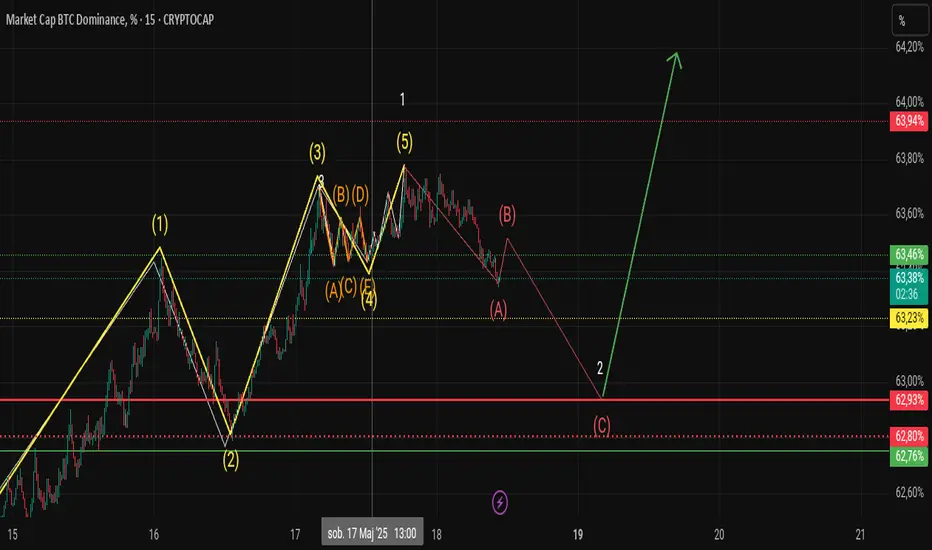 Wygląda na to, niską podfalą 5, skończyliśmy 1 falę i jesteśmy w trakcie fali 2 korekcyjnej abc, po której nastąpi fala 3. Jeśli podczas wzrostu dominacji podczas fali 3, cena BTC zacznie spadać i przebije BOS, to sell in may and go away i widzimy się na 70k w lipcu. Mądrze inwestuj swoje pieniądze.