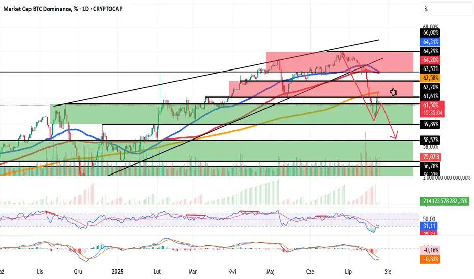 Wskaźnikowo RSI odbiło ze strefy wyprzedaży ale nadal poniżej 50. Na MACD widać zatrzymanie spadków ale strefa ujemna. Spadek dominacji BTC jest gwarancją altseasonu. Niestety w tej hossie wygląda fatalnie na ten moment.