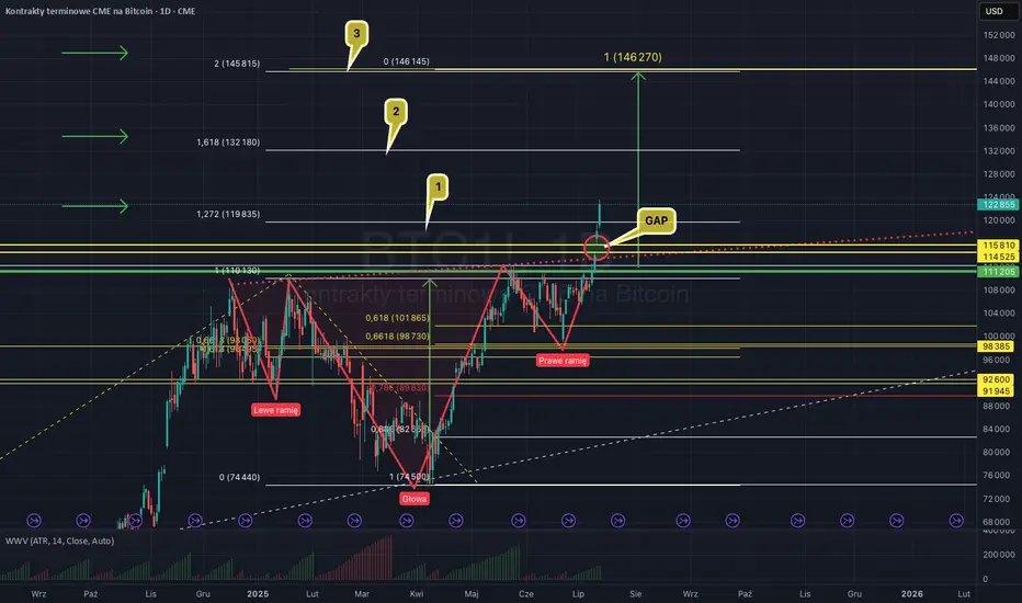 ^ Cena cofa się do zapełnienia GAP’a (114k–115k), potencjalnie testując poziom wybicia z formacji H\&S.