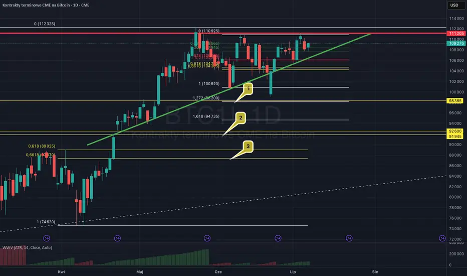 Świetnie — uwzględniając **formację trójkąta symetrycznego**, którego górną granicę stanowi **czerwona linia oporu (\~112 000 USD)**, a dolną **zielona linia trendu wzrostowego**, możemy przygotować **dwa scenariusze tradingowe (long i short)** oparte na wybiciu z tej formacji.