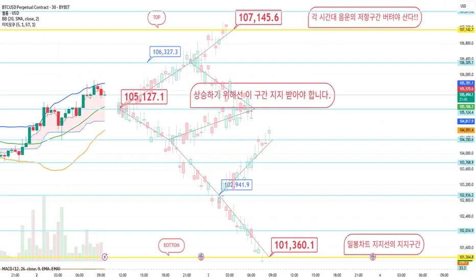 105,127 구간인 30분 차트의 지지선이 깨진다면 각 시간대 지지선 자리인 102,941 자리까지도