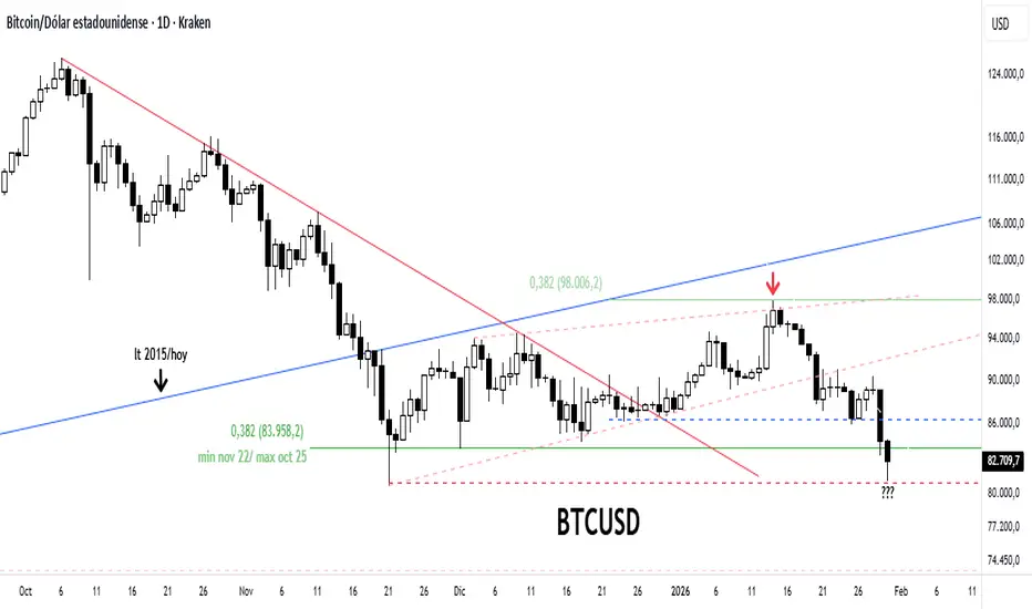 El soporte intermedio apuntado tan solo unos días atrás ( ver informe adjunto ) no aguanto el embate declinante originado como te señalara también en aquel research tras impactar de lleno en el 38.2% de recorte de todo el movimiento declinante previo y por lo tanto ha ido en busqueda de su soporte extremo en esta instancia, representado por aquel mínimo registrado en Noviembre del año 2025 y por el 38.2% de recorte todo el movimiento ascendente entre el mínimo de Nov /22 y el máximo de Oct/25, expresados en términos base cierre semanal. Allí, al menos de momento, han aparecido compradores y ha reaccionado un tanto su precio, pero sin duda es la zona a cuidar/ mantener viva por parte de los bulls, si pretenden revertir la situación extrema en la cual se encuentran.
