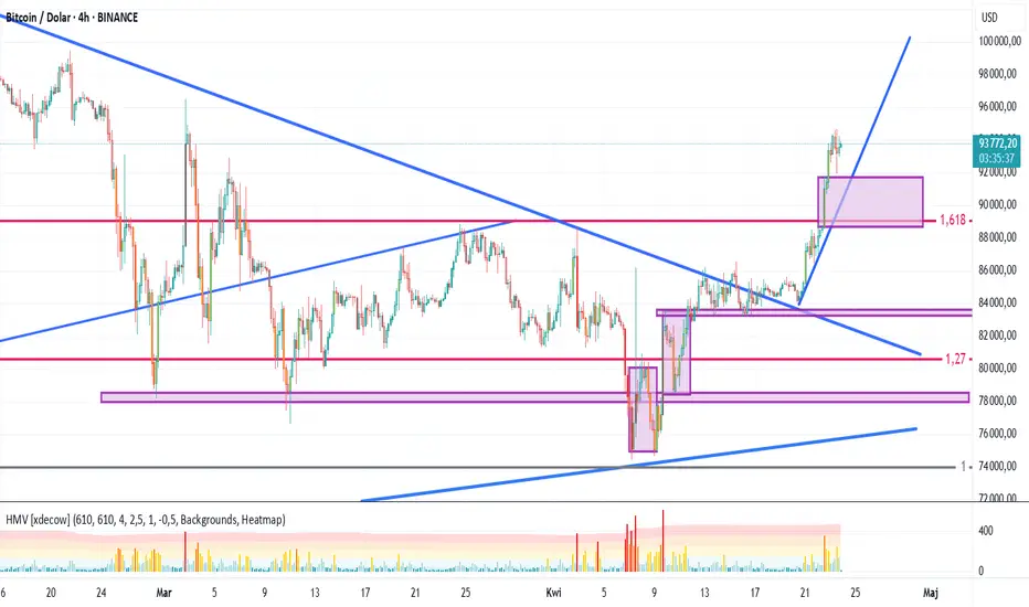 BTC wybił linię trendu spadkowego, stestował w dniu 21.04. i kontynuuje póki co duży trend wzrostowy. Pierwszy duży test to opór w okolicach 101tys$ i 105tys$ (czyli odpowiednio 77,6 i 88,6 FIBO zakresu ostatniej korekty)