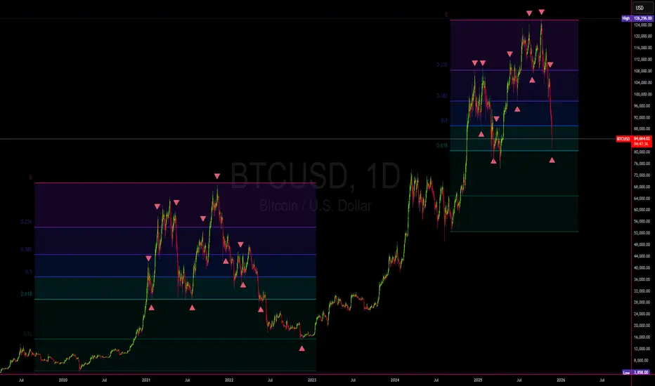 Based on historical Fibonacci and cyclical analysis, Bitcoin, after reaching its 2025 peak at **$124,000**, has entered a corrective phase similar to the 2021–2022 cycle. Currently, it is sitting near the 0.618 Fibonacci level (~$84,000), and if past patterns repeat, the next likely drop extends toward the **0.83 Fibonacci level at $65,000**.