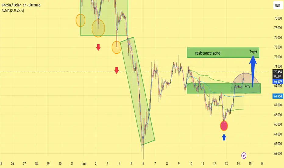 Strefa wejścia: 69 500–70 000 (po potwierdzonym wybiciu i utrzymaniu powyżej szczytu konsolidacji)