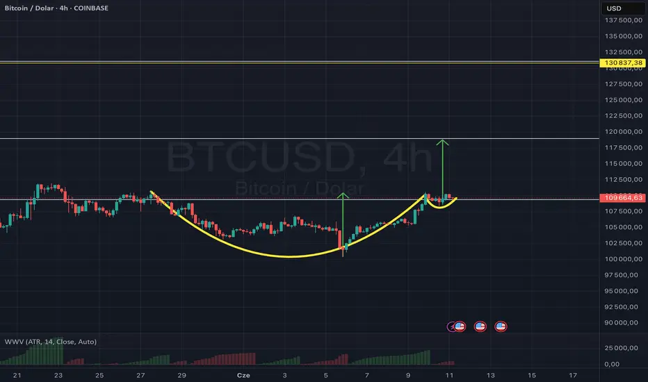 -Wybicie – nastąpiło już wybicie powyżej oporu (ok. 109 500 USD), co aktywuje formację i może zapowiadać dalszy wzrost.