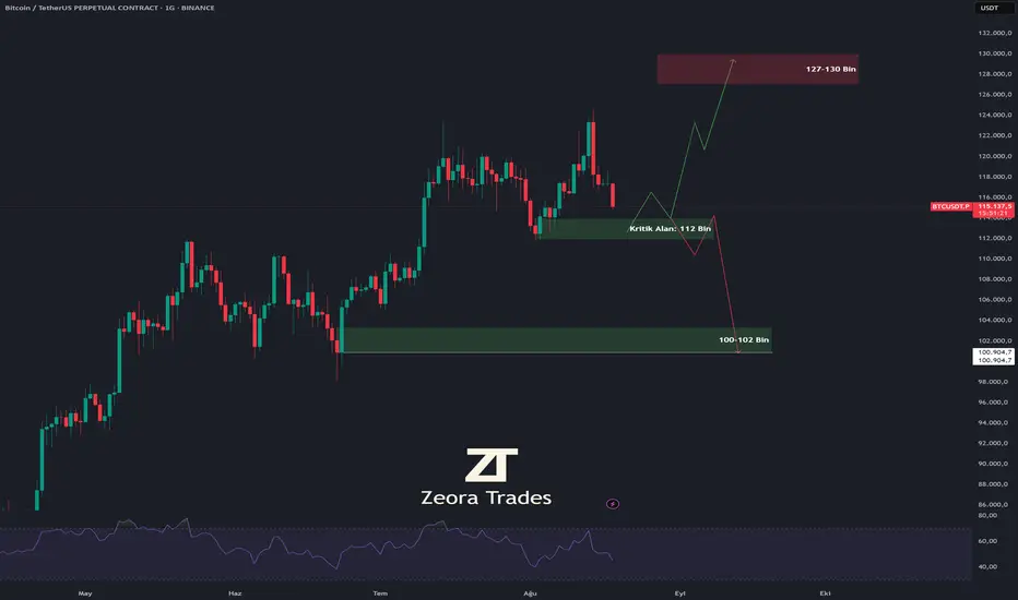 Şuanda Bitcoin 112 bin dolar seviyelerine doğru düşüşe başladı. 112-114 bin dolar aralığından tepki almasını bekliyorum. Burada önemli olan bu tepkinin fiyata ne yaptıracağı. Eğer bu tepki zayıf kalırsa ve fiyata yeni tepeler getiremezse grafikte yeşil kutu ile belirttiğim 102 bin dolar seviyelerine kadar bir düşüş görebiliriz.