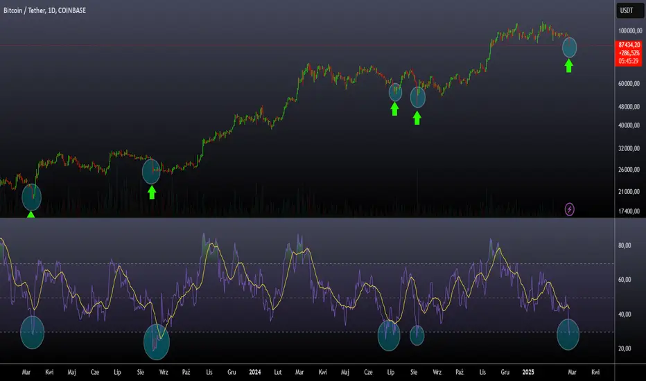 Powyższy wykres podkreśla akcję cenową Bitcoina wraz z Relative Strength Index (RSI) w dziennym przedziale czasowym. Historycznie, za każdym razem, gdy RSI spadał poniżej 30, wskazując na warunki wyprzedaży, Bitcoin doświadczał odbicia cenowego wkrótce potem. Wykres oznacza te momenty niebieskimi kółkami i zielonymi strzałkami, pokazując wyraźne odwrócenia w górę po każdym spadku. Obecnie Bitcoin RSI ponownie spadł poniżej 30, a cena wynosi około 87 000 USD po gwałtownym spadku o 10%. Jeśli poprzednie wzorce się sprawdzą, może to oznaczać nadchodzącą byczą zmianę.