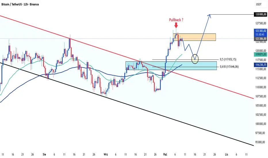 Na podstawie analizy technicznej, BTCUSDT dokonał silnego wybicia z kanału spadkowego. Obecnie Bitcoin napotyka na silny opór w pobliżu poziomu 124 000 USD. Po osiągnięciu szczytu cena może skorygować się do poziomów wsparcia Fibonacciego (0,5 - 0,618), zanim potencjalnie będzie kontynuować ruch wzrostowy.