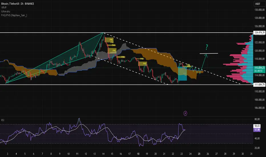 Ichimoku: Der Kurs hat die untere Wolkenlinie durchbrochen und setzt damit ein erstes positives Signal. Der RSI stieg über 57 und signalisiert damit die Rückkehr der Kaufkraft. Das dichte Volumenprofil im Bereich von 115.000 bis 118.000 wird zum nächsten Kursziel. Die FVG-Zone ist noch nicht gefüllt, was die Möglichkeit verstärkt, dass BTC noch Luft nach oben hat.
