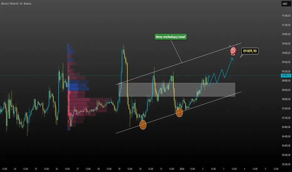 BTCUSDT w dalszym ciągu porusza się w nowo utworzonym kanale wzrostowym, przy czym każde dno jest wyższe od poprzedniego. Cena wielokrotnie reagowała pozytywnie na dolnej linii trendu i w centralnym obszarze popytu, pokazując, że siła nabywcza aktywnie chroni rosnącą strukturę.