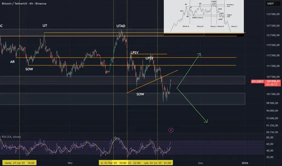 odnosząc się do ostatniej analizy z wykresem wyckoffa nie brałem aż tak na poważnie tej możliwości, lecz patrząc się jak poszło 1:1 to stoimy obecnie na ostatniej decyzji czy jest to faktyczna kontynucja wyckoffa i teraz odbijemy się od oporu i lecimy w dół target 91k obecnie, czy przebijamy 106k i negujemy cały scenariusz.