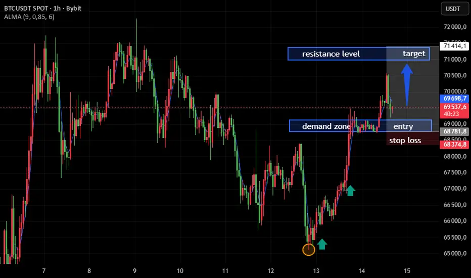 Na wykresie 1-godzinnym BTCUSDT (Bybit) cena wykazuje silną reakcję wzrostową po utworzeniu krótkoterminowego dołka w okolicach 65 000. Struktura rynku została wybita w górę, a kurs konsoliduje obecnie powyżej zaznaczonej strefy popytu, co wskazuje na kontrolę kupujących w krótkim terminie.