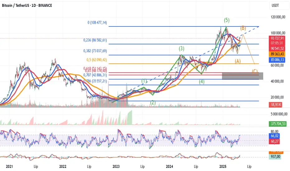 To taki clickbait oczywiście. Ale czy to teoretycznie nie jest możliwe? Założenie: mieliśmy piątkę Eliotta. Po niej powinna nastąpić trójka korekcyjna. Jeżeli tak to pytanie do jakiego poziomu? Tu przyjąłem 0,5 fibo czyli 62000. Niższy ewentualny poziom 0.618 fibo to 51143. Pytanie tylko co miałoby spowodować takie spadki? Odrzucenie propozycji pokojowych przez Rosję? Wojna Izraela z Iranem? A może wojna Indii z Pakistanem? Może być też atak Chin na Tajwan? A przyczyny ekonomiczne? Nieudane działania Trumpa powodujące załamanie rynków w postaci np niedogadania się co do ceł? Wojna z FED? W każdym bądź razie przyczyna takich spadków musi być poważna, a cios zadany rynkom dotkliwy. Jak na ten moment nic na to nie wskazuje więc cały ten scenariusz to tylko clickbait jak wyżej.