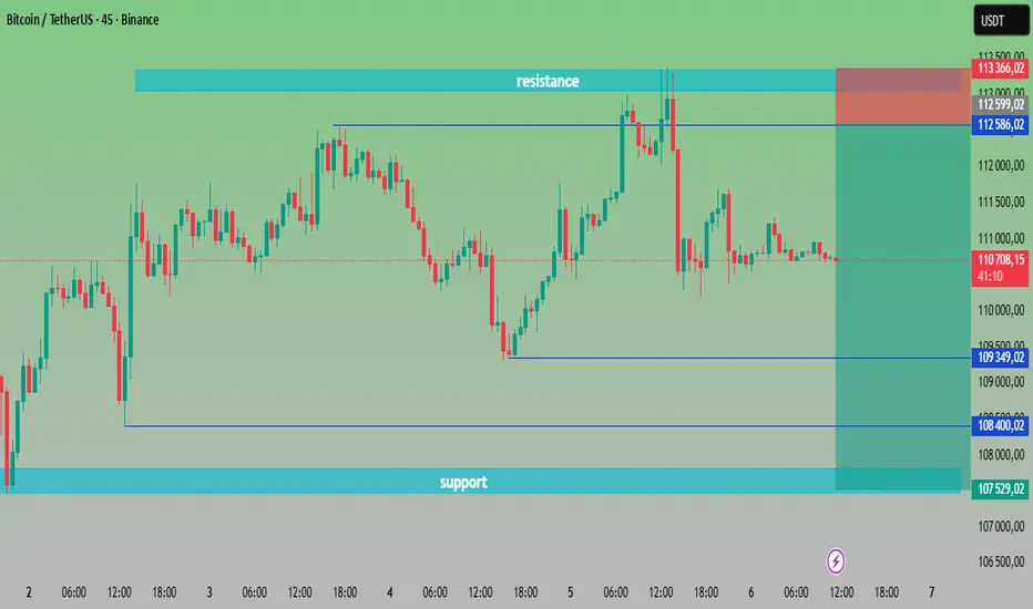 Scenariusz spadkowy 🔴📉 – Jeśli BTC spadnie poniżej 109 349 USDT, możliwy jest ponowny test wsparcia w okolicach 107 500 USDT.