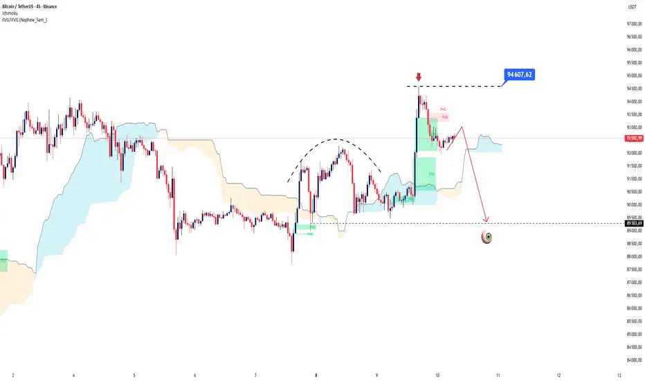 Po silnym wypchnięciu do obszaru 94,6 tys. cena została zdecydowanie odrzucona i utworzyła zakrzywioną górną strukturę z obszarami FVG, które nie zostały zawężone, co pokazało, że presja dystrybucyjna dominuje.