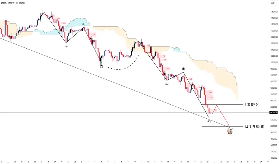 BTC kontynuuje ruch zgodnie ze malejącą strukturą ABC, tworząc falę (C) dotykającą długoterminowej linii trendu na ramce 4H. Powyższe klastry FVG nie zostały jeszcze zapełnione, co pokazuje, że może pojawić się techniczna presja na ożywienie gospodarcze – ale tylko tymczasowo, aby cena mogła stworzyć strefę dystrybucji przed dalszym spadkiem.