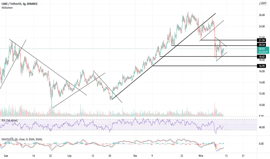 CAKE to kolejne alty którym kierunek nadaje BTC. Dlaczego zepsute? Ano dlatego że od dołka poruszały się pięknym ruchem wzdłuż linii trendu dopóki trend nie został złamany. Dlaczego raj trejdera? Ano dlatego że jak widać na wykresie CAKE zaliczały równiutkie korekty które można było rozgrywać na DT Jakby je jakieś boty prowadziły. Z kolej dla osób które grają spokojniej w dłuższym horyzoncie czasowym można posługiwać się prostymi liniami trendu dającymi niezłe sygnały kupna i sprzedaży. Ciasteczka należą do altów które zaliczyły blisko 80 proc korektę a odbicie nastąpiło zaledwie do 0,5 fibo poprzedniego ruchu. Na wykresie widać wybicie z niedźwiedziej flagi. Obecnie kurs porusza się w trójkącie. Kierunek nada BTC. Ze względu na to co wyżej alt do obserwacji i stosowania prostej strategii linii trendu.