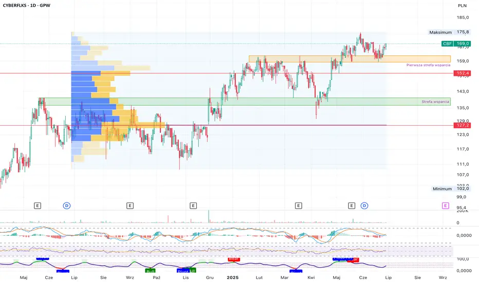 Podsumowując, techniczny obraz Cyber_Folks pozostaje pozytywny. Kurs akcji znajduje się w wyraźnym trendzie wzrostowym, co potwierdza utrzymanie kluczowych poziomów wsparcia oraz układ średnich EMA. Najbliższą, istotną strefą wsparcia jest poziom poprzedniego ATH oraz wsparcie przedziale 152–155 zł, którego obrona będzie sprzyjać kontynuacji trendu wzrostowego. W pozytywnym scenariuszu wybicie ostatniego maksimum (175,8 zł) z potwierdzonym wolumenem otworzy drogę do dalszych wzrostów. Ewentualne przełamanie strefy wsparcia 152–155 zł powinno być sygnałem ostrzegawczym, sugerującym możliwość głębszej korekty.