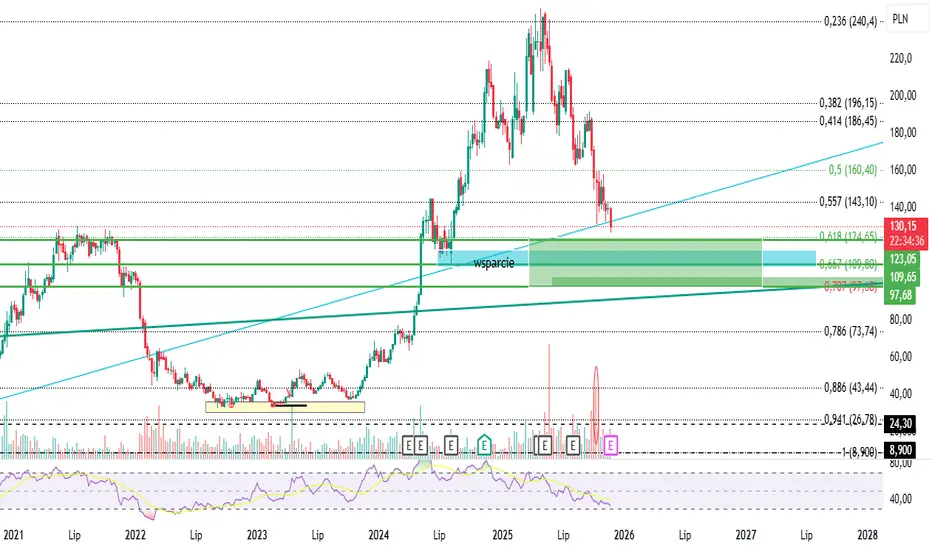 Spółka CCC zbliża się do ważnych stref popytowych rozciągających się między 124–98 zł. W tym obszarze przebiega również istotne wsparcie wynikające z wcześniejszych reakcji ceny, które zapoczątkowały silny ruch wzrostowy. Obserwujemy strefę w oczekiwaniu na sygnał odwrócenia – najlepiej formację świecową z interwału 1T oraz potwierdzenie w postaci niskiego RSI.