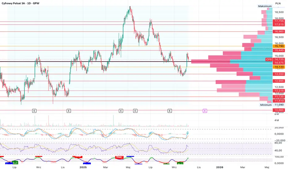 od mojej ostatniej analizy minęło trochę czasu, a dziś przyglądam się bliżej spółce Cyfrowy Polsat (CPS). Kurs w ostatnich tygodniach zaliczył solidne odbicie po zejściu w okolice 13,4 zł, jednak po dynamicznym wzroście dotarł do okolic ostatniego szczytu, który zatrzymał byki. Wykres zaczyna pokazywać oznaki możliwej krótkoterminowej korekty, jednak sytuacja techniczna wciąż pozostaje otwarta.
