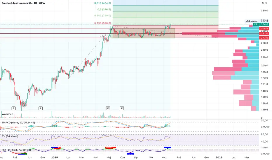 Największe nagromadzenie wolumenu widać w okolicach 291–308 zł. To poziomy, gdzie inwestorzy handlowali najintensywniej w ostatnich miesiącach – strefa równowagi, którą można traktować jako główne wsparcie. POC znajduje się w rejonie ok. 291 zł. To najważniejszy punkt odniesienia – dopóki kurs utrzymuje się powyżej, przewaga jest po stronie kupujących. Powrót poniżej POC zwiększyłby ryzyko powrotu do długotrwałej konsolidacji. Kurs wybił się ponad strefę równowagi (308–310 zł) i zyskuje przestrzeń do dalszego wzrostu. Wyjście górą z tak szerokiej konsolidacji (trwającej od kwietnia do września 2025) jest technicznie mocnym sygnałem.