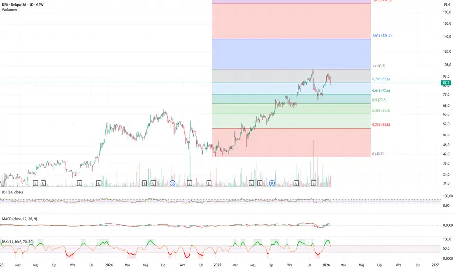 Jeśli spojrzeć na zniesienia Fibonacciego liczonego od dołka do szczytu to kurs właśnie testuje 78,6% natomiast kolejny poziom wsparcia jest już w okolicy EMA200. Przebicie tego poziomu w mojej ocenie sprowadzi kurs na 50% zniesienia Fibonacciego czyli 70zł gdzie w mojej ocenie doszłoby dopiero do próby obrony i powrotu w okolice 80-85zł czyli obecnych poziomów. Jednak zakładam, że przejście poniżej choćby 80zł może doprowadzić już do większej wyprzedaży akcji u inwestorów posiadających akcje z np. z 2024 roku.