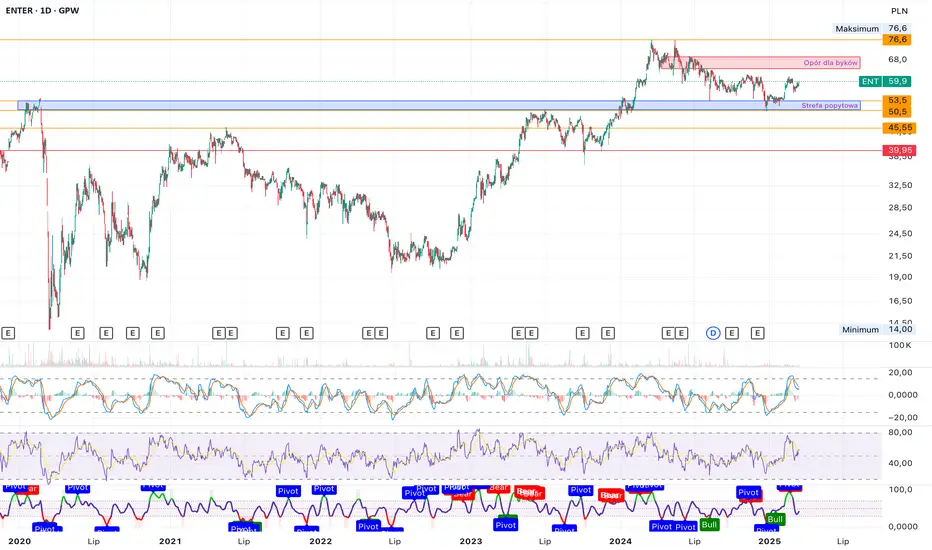 Podsumowując, mieliśmy silny trend wzrostowy, w którym dotarliśmy do ATH i rozpoczęliśmy korektę, a następnie konsolidację. Dla byków kluczowym do utrzymania jest poziom strefy popytowej 50,5-53,5 zł. Przebicie tej strefy w dół będzie negacją strategii wzrostowej, a celem dla niedźwiedzi może być nawet poziom 40 zł. Natomiast pozytywnym scenariuszem będzie wyjście powyżej oporu.
