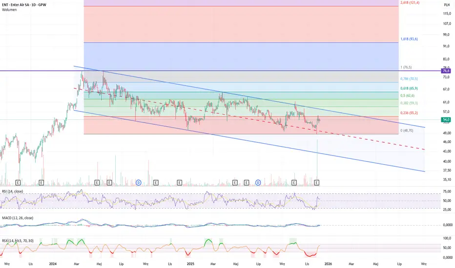 Główny opór to 62zł czyli 50% zniesienia Fibonacciego, ale najpierw do pokonania niebieska linia EMA200 na 56,2zł, która może być wsparciem w przypadku braku wyłamania kanału spadkowego przy najbliższym podejściu.