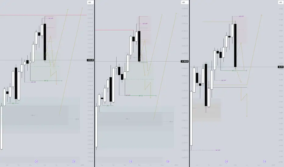 ES - bardzo duży spadek z aktywacją SMT w1 w ładnym synchro. Dodatkowo na ES i NQ mamy dobre PA, które wskazuje na niższe poziomy, min. pogłębienie poprzedniego tygodnia. Dalekim, ale bardzo atrakcyjnym poziomem płynności jest ostatnie aktywne SMT pod zielonymi strefami, jeśli cenie uda się zejść poniżej 50% tych stref, prawdopodobnie wtedy już dojdziemy aż po to LIQ.