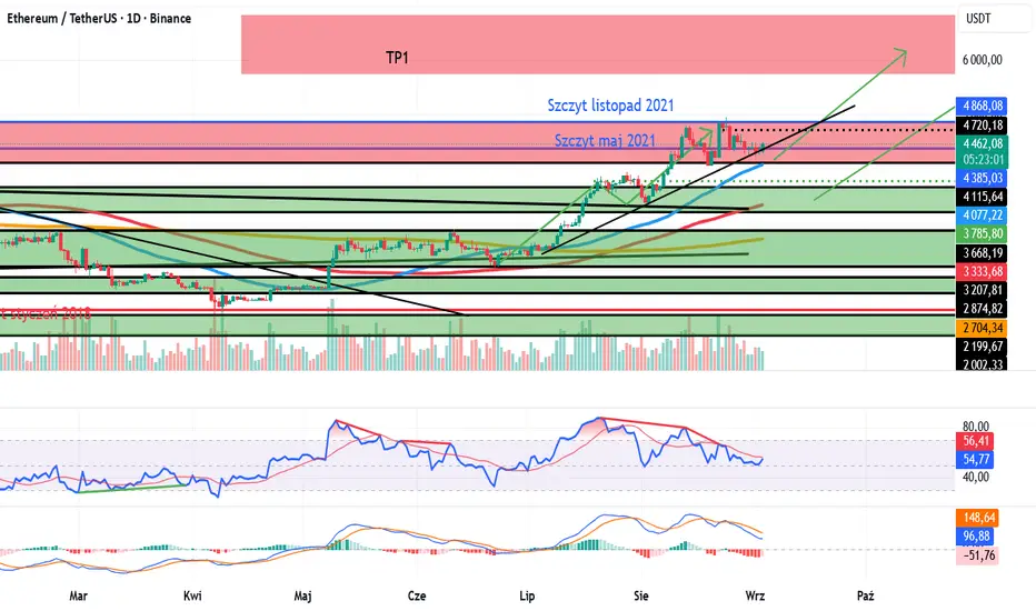 ETH skorygował jak cała reszta. ATH był pułapką. Jednak spadki nie są duże i kurs jak na razie zachowuje się dobrze. Mamy czerwoną strefę oporu jednak na ten moment nie doszło do wybicia dołem. Jak widać na wykresie zaznaczyłem dwa potencjalne obszary odbicia po nowe ATH. Drugi zielony przy większej korekcie na BTC. Jak dla mnie nie jest to miejsce do kupowania. Sam zamknąłem pozycje long futures. Czy doczekam się zejścia do dobrej strefy zakupu nie wiem. Jeżeli nie to trzeba będzie rozgrywać ETH inaczej. Wskaźnikowo zarówno RSI jak i MACD uległo schłodzeniu. RSI utrzymuje się powyżej 50. ETH/BTC również pokazuje siłę alta. Na spadku kursu mamy spadek obrotów. Dla mnie do obserwacji. Oczywiście hodlerzy nogi na stole i szklaneczka whisky. Cygaro?