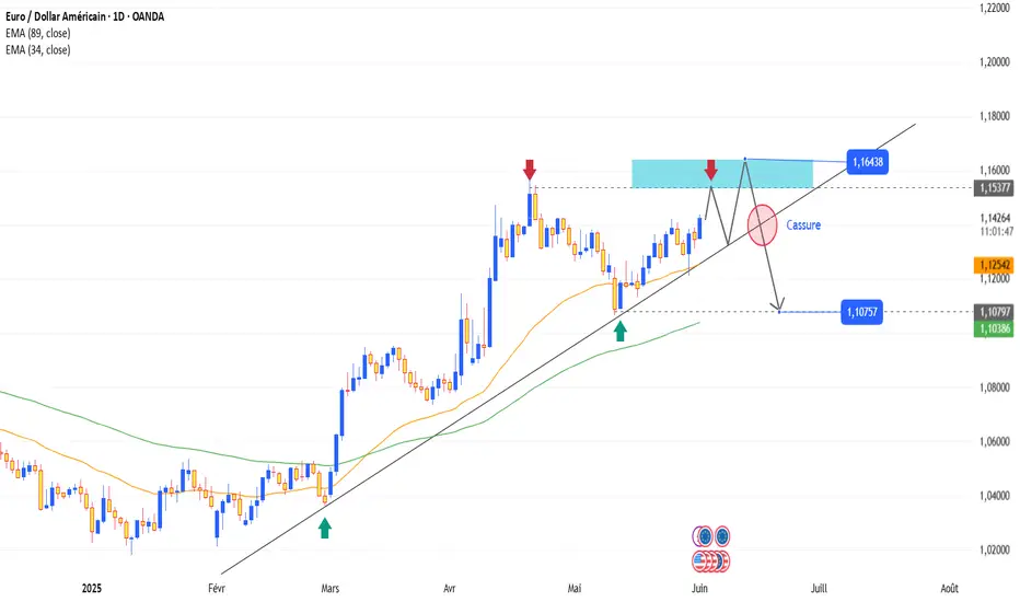 Sur le graphique journalier, l’EURUSD approche de la zone de résistance à 1.16438 – une zone qui a déjà rejeté les prix auparavant. Le dernier rebond semble s’affaiblir, et la ligne de tendance haussière est menacée de rupture.