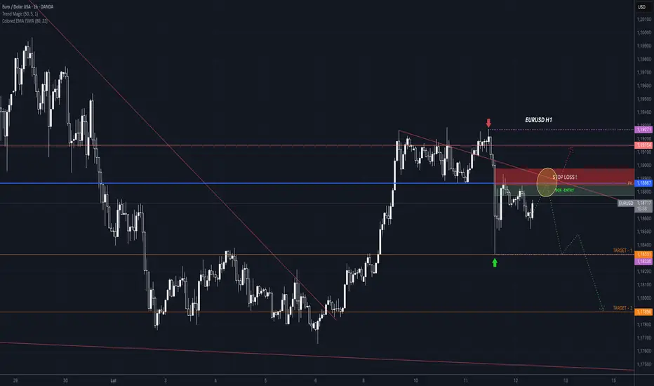 ⚠️ WAŻNE: Jeśli świeca H1 zamknie się NAD niebieską linią (1,18867), scenariusz spadkowy zostaje ANULOWANY. W takim przypadku nie otwieramy pozycji.
