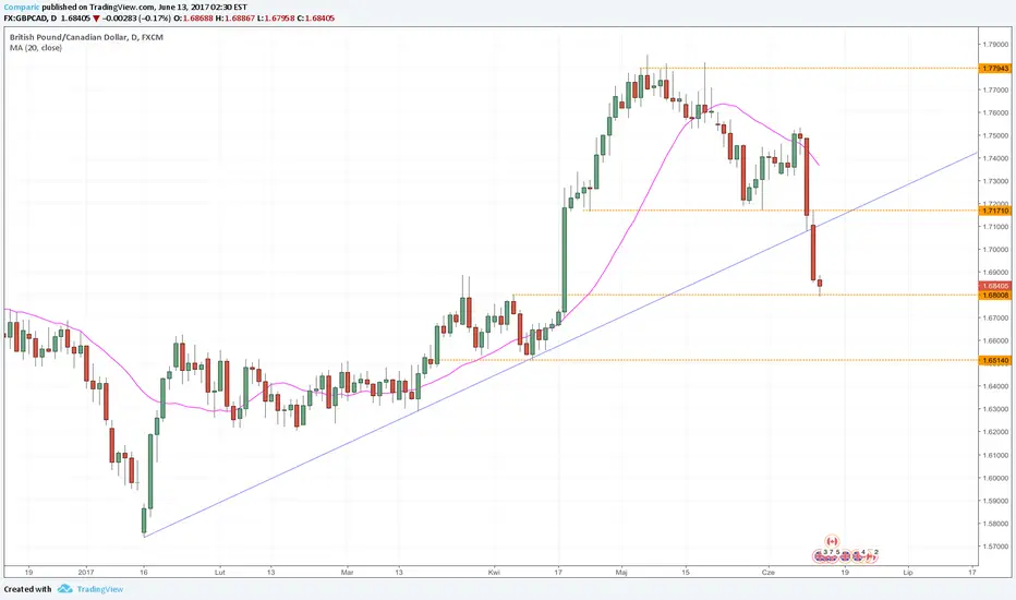 Na parze walutowej GBPCAD odnotowano wczoraj kolejny dzień silnych spadków, gdzie przełamana została linia trendu wzrostowego prowadzona od minimów z 16-go stycznia br. Cena bardzo szybko dotarła do strefy popytowej blisko 1.6798 skąd w drugiej połowie kwietnia doszło do dynamicznego ruchu w kierunku północnym.