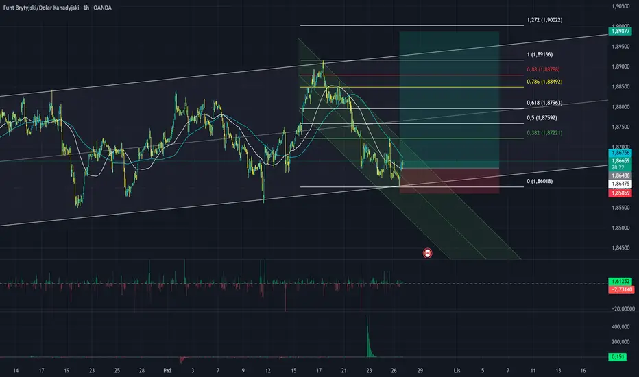 Po dynamicznym ruchu spadkowym cena przetestowała wsparcie w rejonie 1.8600–1.8650 oraz dolną linię regresji, skąd pojawiła się reakcja popytowa.