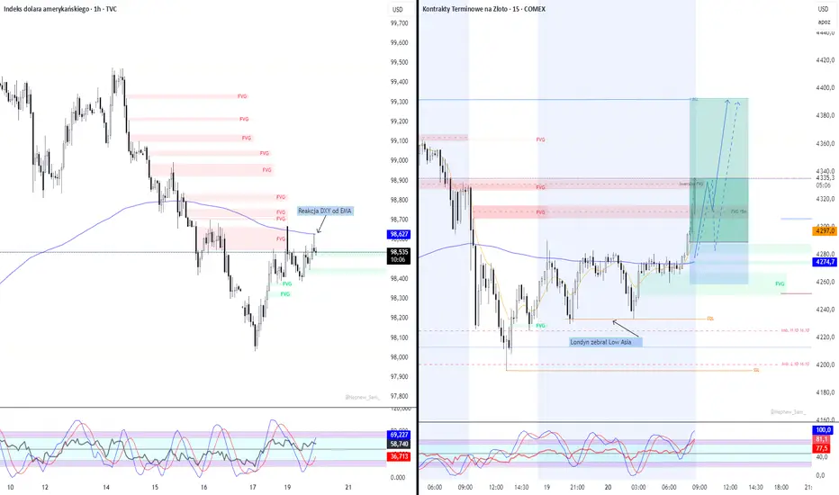 **Bigger Picture:** DXY na 1H odbija od 200 EMA oraz górnych −FVG, co potwierdza chwilową reakcję podażową. Złoto na 15 m po wybiciu z konsolidacji wykonało test +FVG i wróciło powyżej 200 EMA. Struktura wzrostowa utrzymana.
